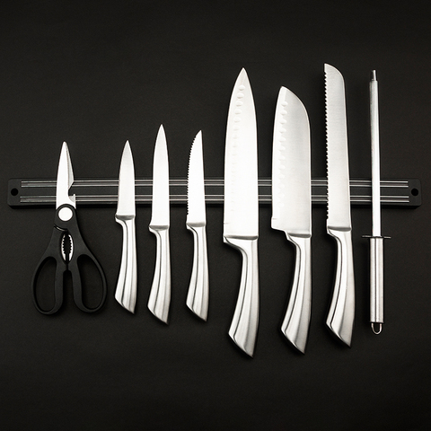 Juego de cuchillos de chef de cocina de 9 piezas de acero inoxidable 3cr13 con logotipo personalizado con metal real para MANGO hueco